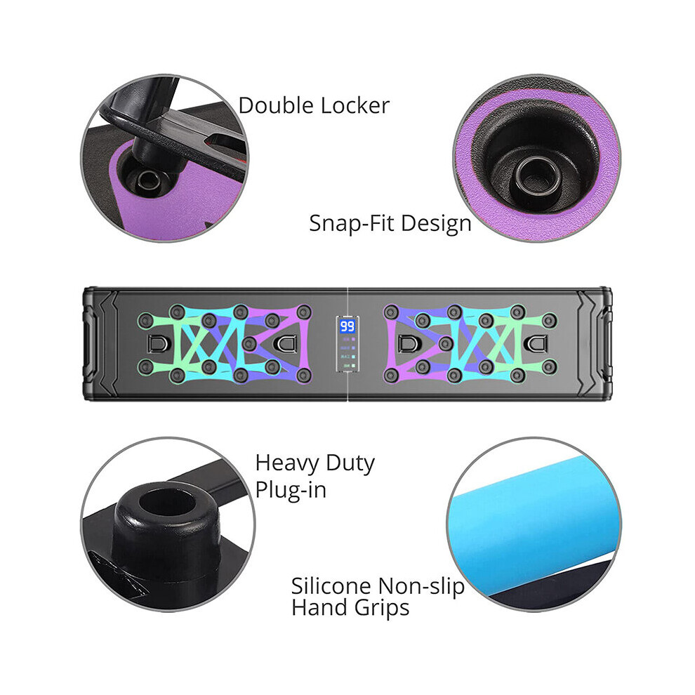 --Heavy duty "Plug & Press" push up board system with multiple positions and angles that sculpt and maximize upper body definition.